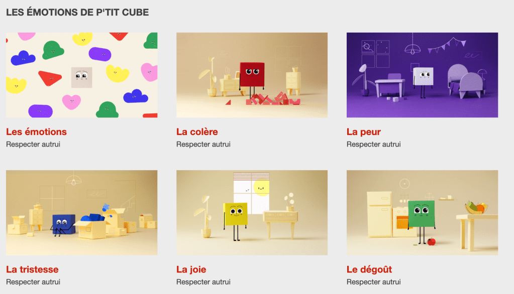 Excellente série de vidéo dont je me sers pour aborder les différentes émotions, mes élèves sont très réceptifs vis-à-vis de ce type de contenu. Une fois abordé, on peut ces différentes notions dans différentes matières : arts, écriture poétique, etc.